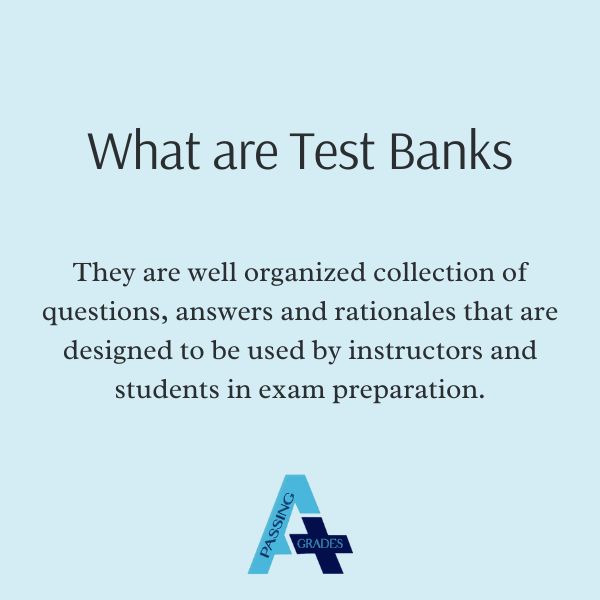 Instructors use test banks to create exams while students use test banks to revise for upcoming exams. Test Banks are also often referred to as Exam Banks or Exam Packs. They have different kind of questions for different exam levels such as true/false statements, multiple-choice questions and essay prompts.